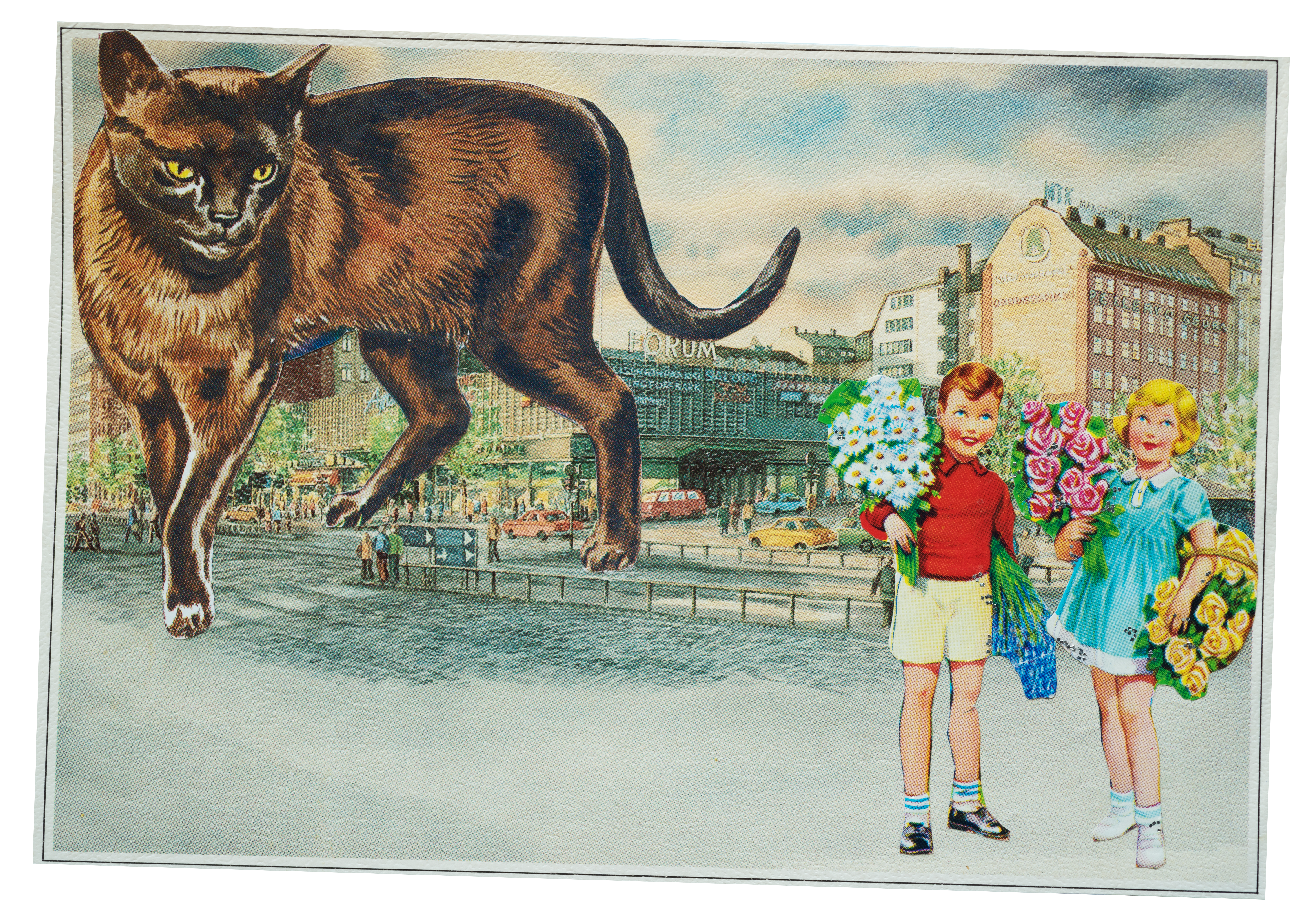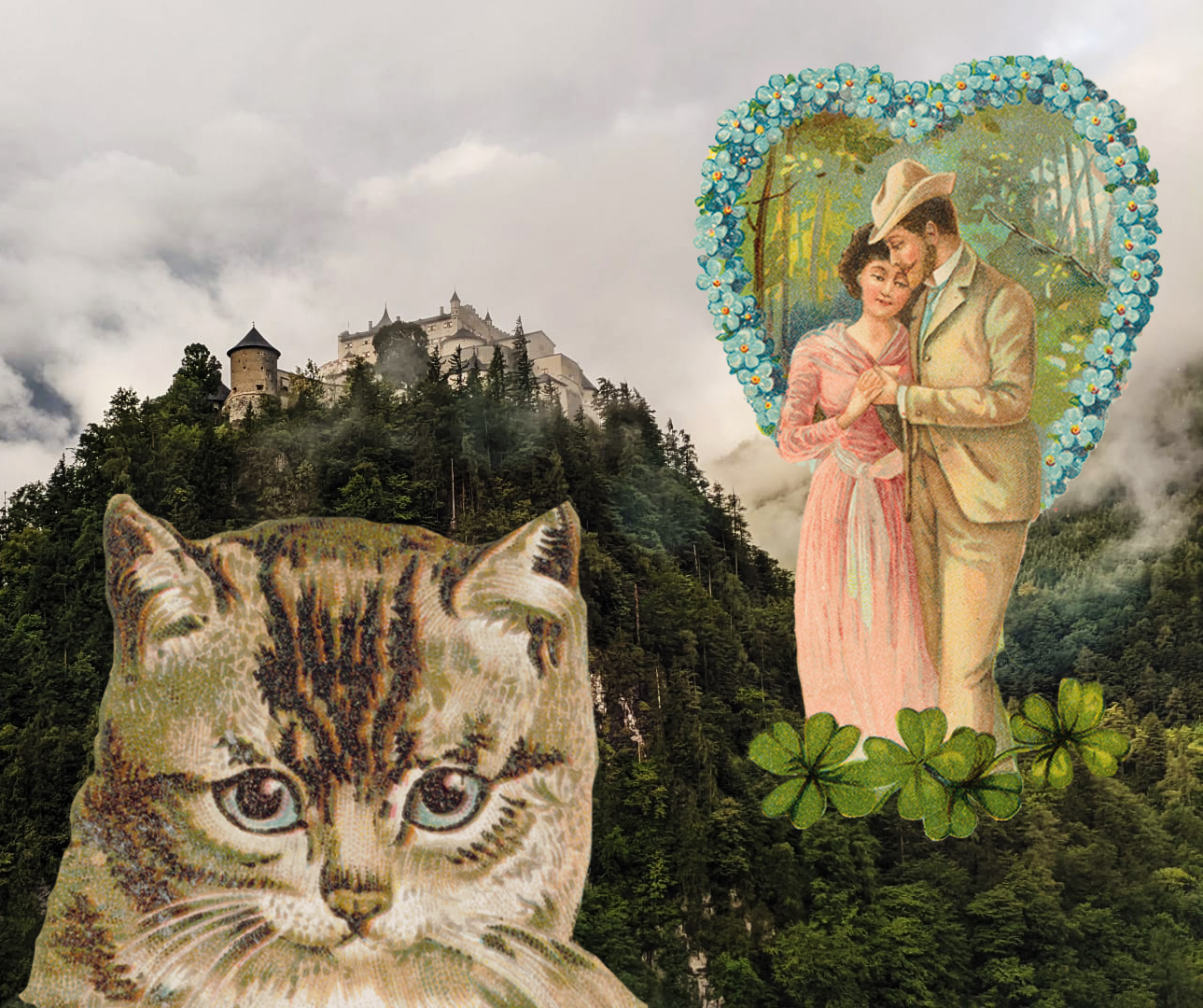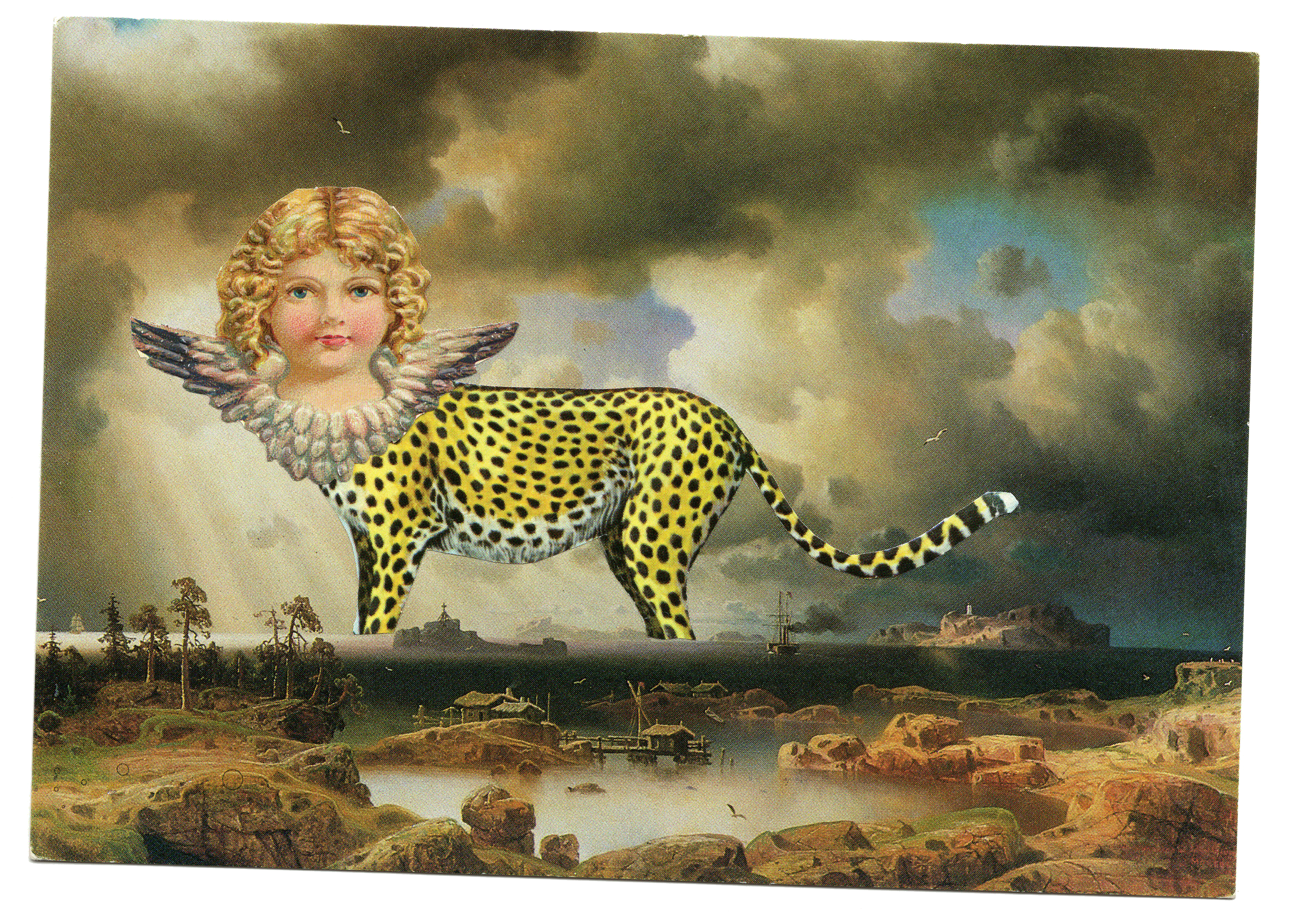 My collage work is highly intuitive. I collect vintage postcards, and whenever I stumble upon one that I feel like is lacking something, I put it in my future collage project stash. I like to think of each finished piece as a kind of miniature story: sometimes, they reflect my memories or dreams, and sometimes, they are jokes with references to classical literature, art history, and meme culture.